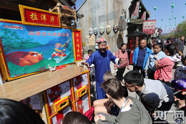 外國游客與民間藝人互動。(央廣網(wǎng)記者 韓靖 攝)