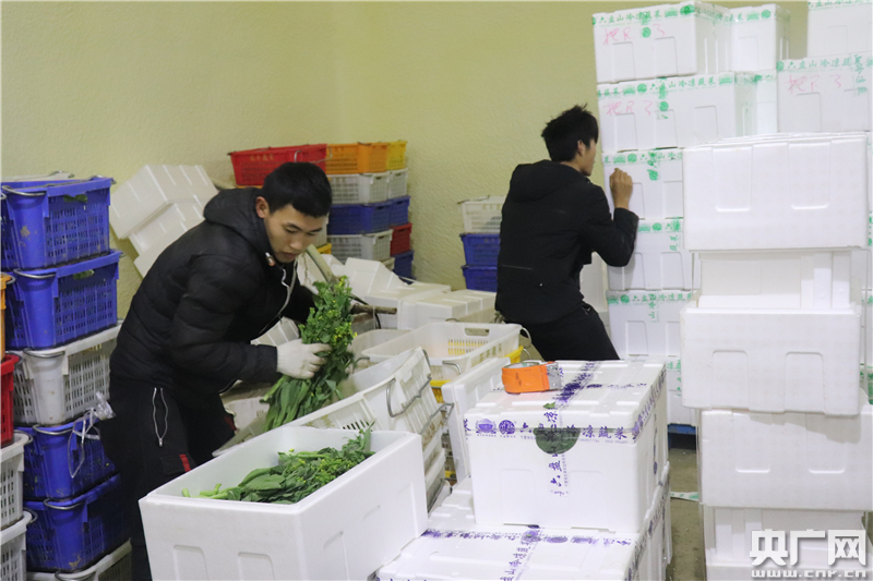 圖為工人們?cè)陬A(yù)冷庫里將蔬菜裝箱。(央廣網(wǎng)記者 母晨靜 攝)