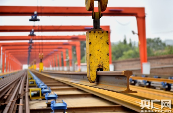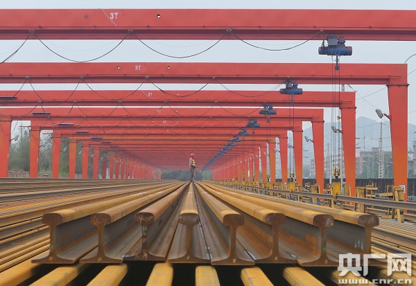 在蘭州工務(wù)段河口南焊軌基地,記者看到,軌排長(zhǎng)得像蜈蚣,但正是這些密密麻麻的“腿”支撐你我出行的路。(央廣網(wǎng)記者王晶 攝)