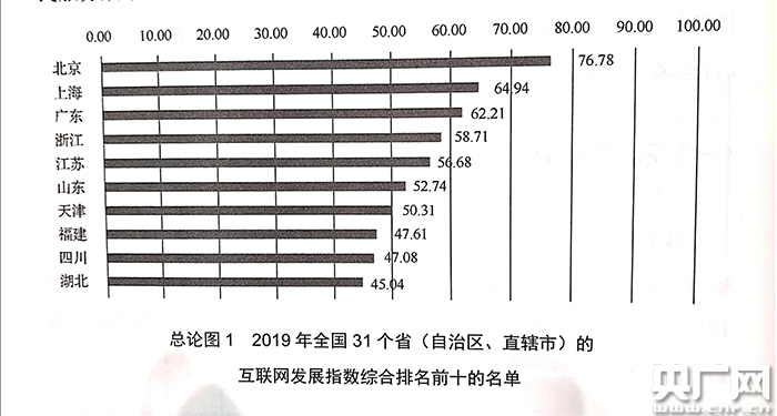 據(jù)《報(bào)告》,2019年全國31個省(自治區(qū)、直轄市)的互聯(lián)網(wǎng)發(fā)展指數(shù)綜合排名前十的名單為:北京、上海、廣東、浙江、江蘇、山東、天津、福建、四川、湖北。經(jīng)濟(jì)發(fā)達(dá)地區(qū)的互聯(lián)網(wǎng)發(fā)展水平最高,中西部地區(qū)也在加大發(fā)展力度,發(fā)展勢頭強(qiáng)勁。