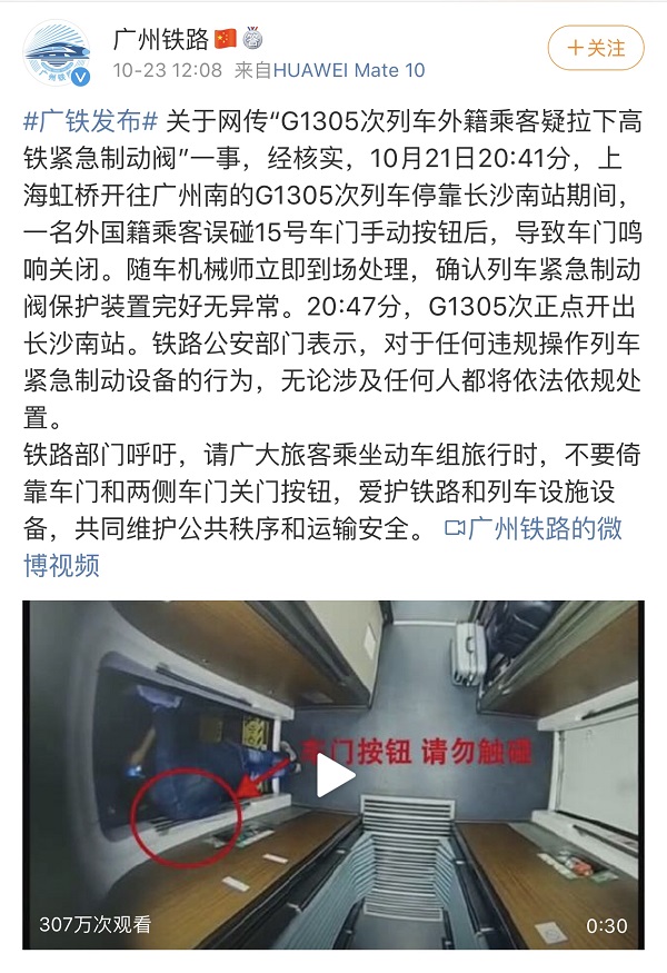 今日(23日)中午,中國(guó)鐵路廣州局集團(tuán)公司官方微博發(fā)布消息,介紹了事件經(jīng)過:10月21日20時(shí)41分,上海虹橋開往廣州南的G1305次列車?块L(zhǎng)沙南站期間,一名外國(guó)籍乘客誤碰15號(hào)車門手動(dòng)按鈕,導(dǎo)致車門鳴響關(guān)閉。隨車機(jī)械師立即到場(chǎng)處理,確認(rèn)列車緊急制動(dòng)閥保護(hù)裝置完好無異常。20時(shí)47分,G1305次正點(diǎn)開出長(zhǎng)沙南站。