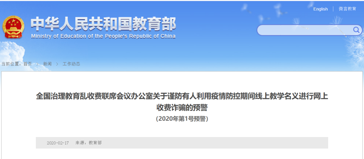 對此,全國治理教育亂收費聯(lián)席會議辦公室今日(17日)發(fā)布2020年第1號預(yù)警:謹(jǐn)防有人利用疫情防控期間線上教學(xué)名義進行網(wǎng)上收費詐騙。預(yù)警提醒,延期開學(xué)期間,教育部整合國家、有關(guān)省份和學(xué)校優(yōu)質(zhì)教學(xué)資源,開通國家中小學(xué)網(wǎng)絡(luò)云平臺和中國教育臺電視空中課堂及部分省份網(wǎng)絡(luò)學(xué)習(xí)平臺,并提供有關(guān)教材電子版、“人教點讀”數(shù)字教學(xué)資源庫等學(xué)習(xí)資源,均為免費提供,對借此名義收取相關(guān)費用的行為,一定要提高警惕,并保存好相關(guān)證據(jù)、及時報警。