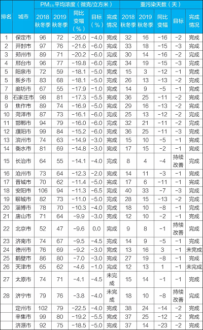 京津冀及周邊地區(qū)“2+26”城市PM2.5平均濃度為70微克/立方米,同比下降13.6%;重污染天數(shù)同比下降36.2%,超額完成PM2.5平均濃度同比下降4%、重污染天數(shù)同比減少6%的改善目標(biāo)。