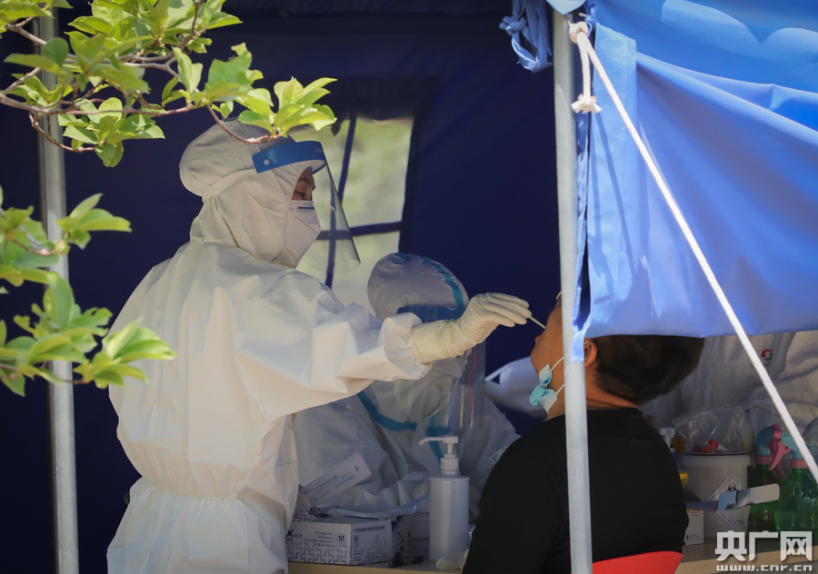 6月18日,在北京市豐臺(tái)區(qū)一集中采樣點(diǎn),醫(yī)務(wù)人員正在為居民采集咽拭子(央廣網(wǎng)記者 韓靖 攝)