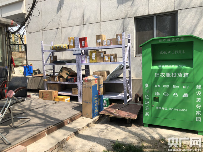 北京市豐臺區(qū)太平橋西里小區(qū)為疫情防控專設(shè)的快遞架(央廣網(wǎng)記者王晶 攝)