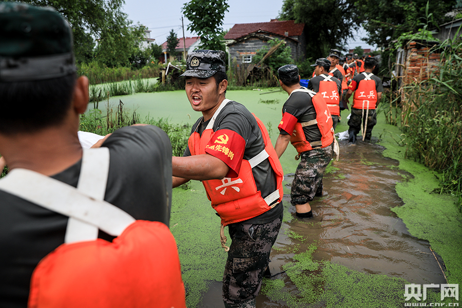官兵排成一排傳送沙土袋(央廣網(wǎng)記者 石昊鑫 攝)