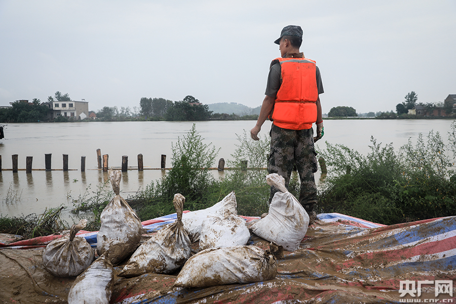 官兵在同大圩筑堤(央廣網(wǎng)記者 石昊鑫 攝)