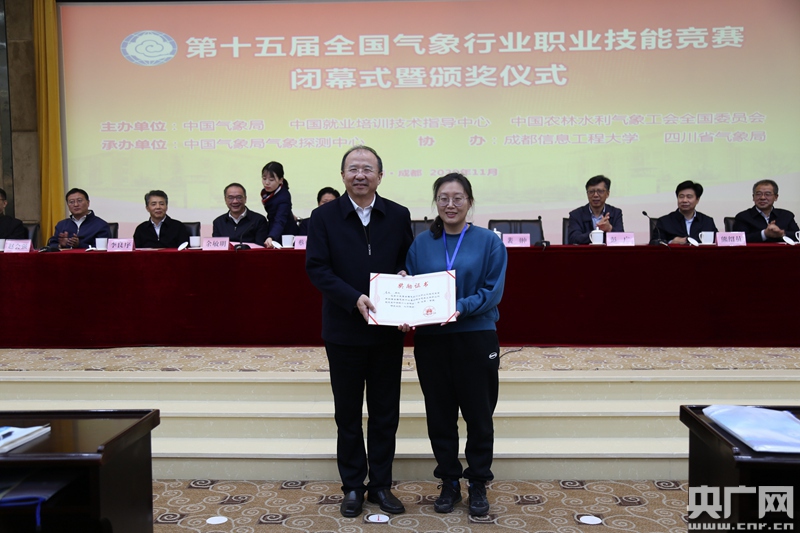 閉幕式上,中國氣象局副局長于新文與山東省氣象局代表隊獲獎選手李鳳合影(央廣網記者 孫冰潔 攝)