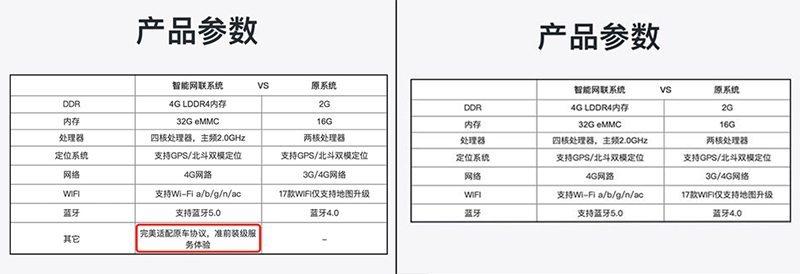 “WEY·道”APP商城“智聯(lián)升級(jí)禮包”產(chǎn)品參數(shù)宣傳頁(yè)。左圖為車主覃先生2020年7月份截圖,右圖為2020年12月31日截圖(圖片來自車主覃先生供圖、網(wǎng)絡(luò)截圖)