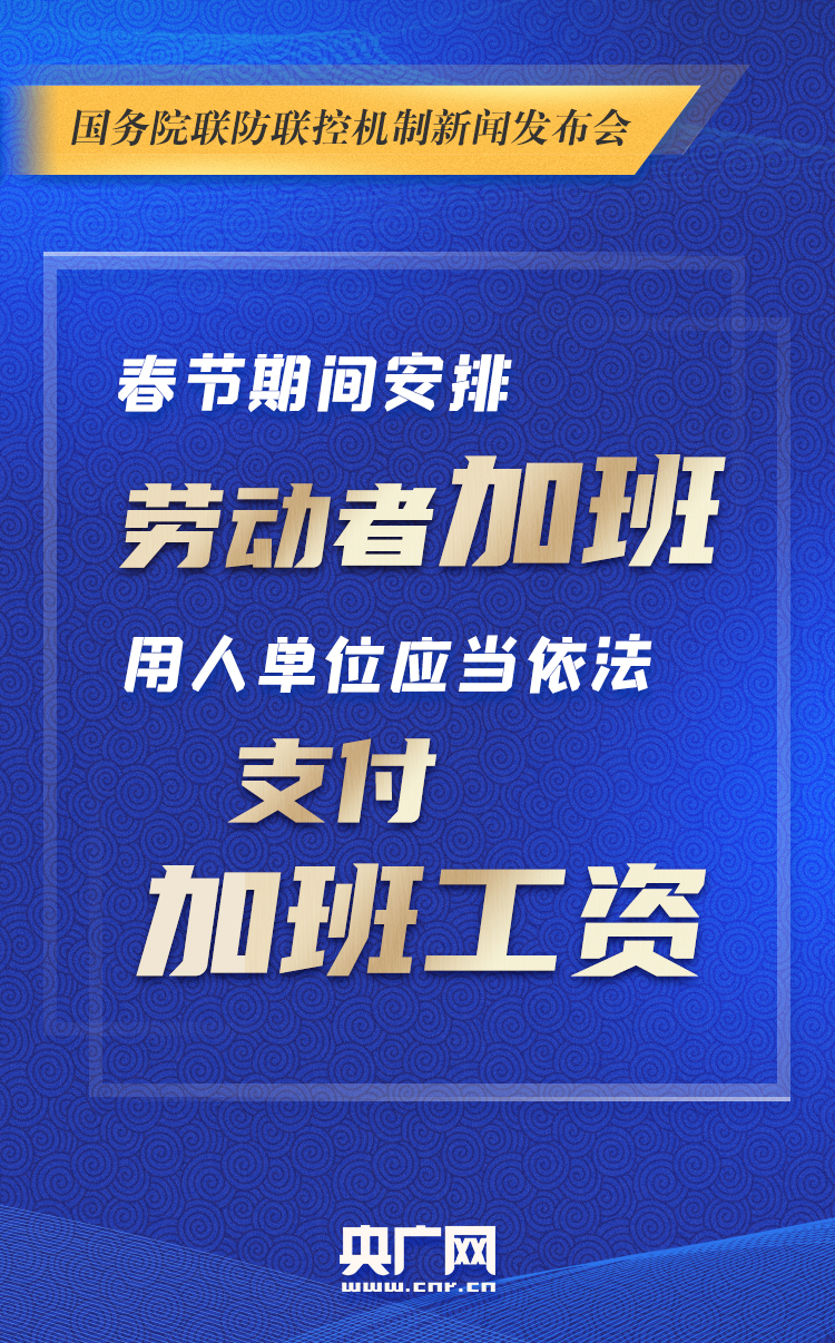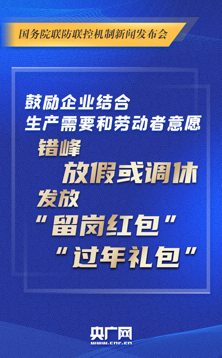 27日,國務(wù)院聯(lián)防聯(lián)控機(jī)制舉行“就地過年服務(wù)保障工作”發(fā)布會,指出各地要合理有序引導(dǎo)人民群眾就地過年,堅決不允許“一刀切”;在春節(jié)期間安排勞動者加班的,用人單位應(yīng)當(dāng)依法支付加班工資;增加網(wǎng)絡(luò)、電視、廣播等文化體育節(jié)目供應(yīng),鼓勵提供免費流量、網(wǎng)絡(luò)視頻APP限時免費電影放映等線上服務(wù)……更多要點,戳圖查看!