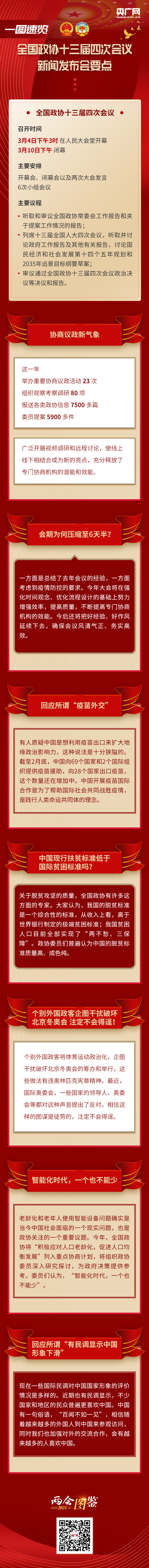 3月3日,全國政協(xié)十三屆四次會議舉行新聞發(fā)布會,大會新聞發(fā)言人郭衛(wèi)民向中外媒體介紹本次大會有關(guān)情況,并答記者問。一圖速覽要點。