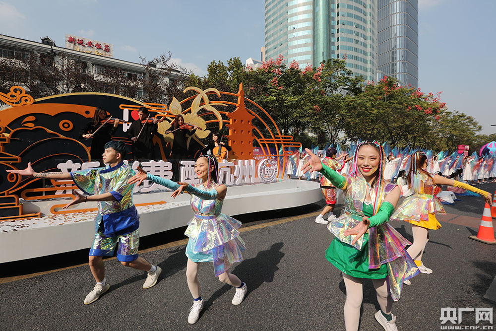 11月10日,舞者在“新消費 醉杭州”花車前表演舞蹈(央廣網(wǎng)記者 魏煒 攝)