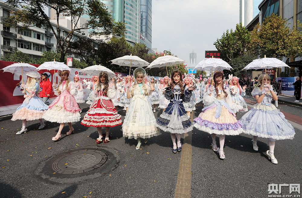 11月10日,“夢幻王國”花車邊穿著“洛麗塔”風(fēng)格服飾的演員在表演(央廣網(wǎng)記者 魏煒 攝)