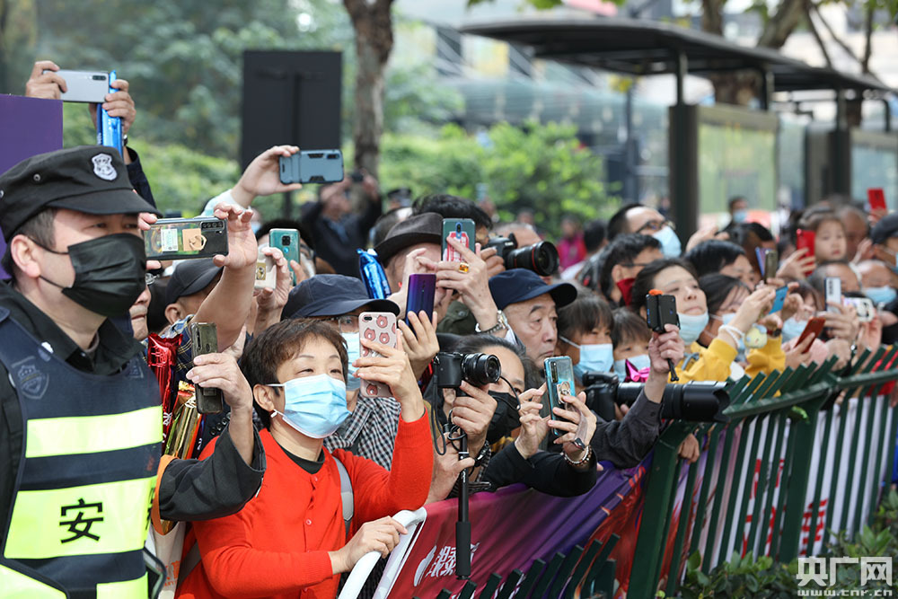 11月10日,杭州武林商圈街頭市民圍觀巡游感受歡樂氛圍(央廣網(wǎng)記者 魏煒 攝)