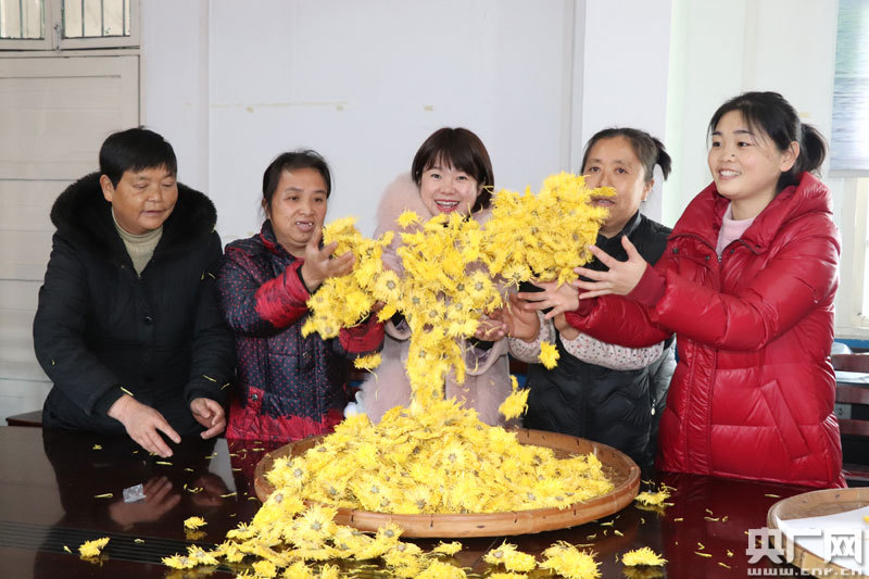 安源鎮(zhèn)張家灣村貧困戶用豐收的干菊花擺出元旦快樂字樣(央廣網(wǎng)發(fā) 通訊員鄔斌 攝)