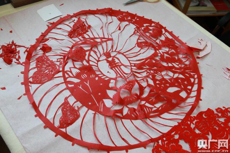 記者最近就來到了一位剪紙藝術(shù)家王慶松的工作室,首先看到了一個(gè)剛剛由王慶松老師剪好的直徑約有五十厘米的紅紅的大團(tuán)花,這個(gè)大團(tuán)花有八只狗與牡丹花組成,王慶松告訴記者這幅作品花費(fèi)了整整三天的時(shí)間完成,代表瑞犬迎新春。 -
