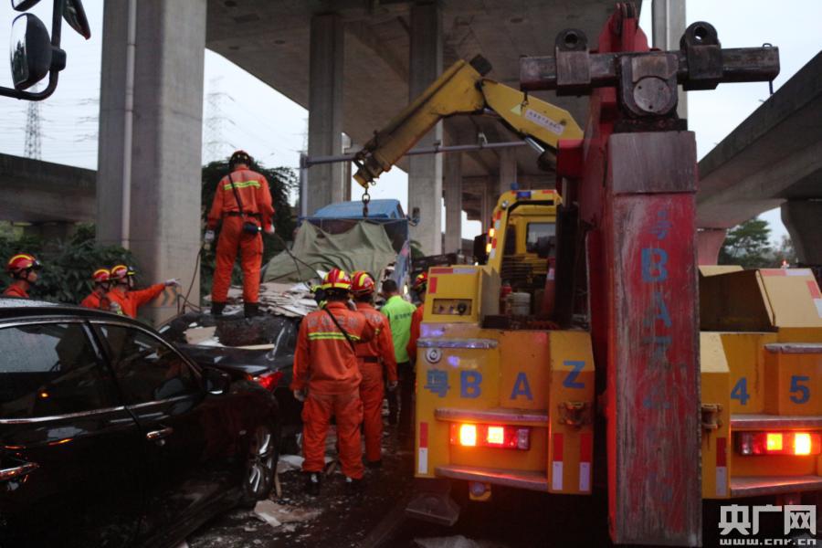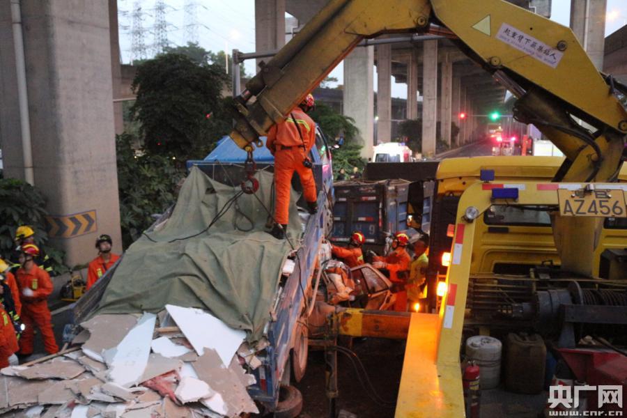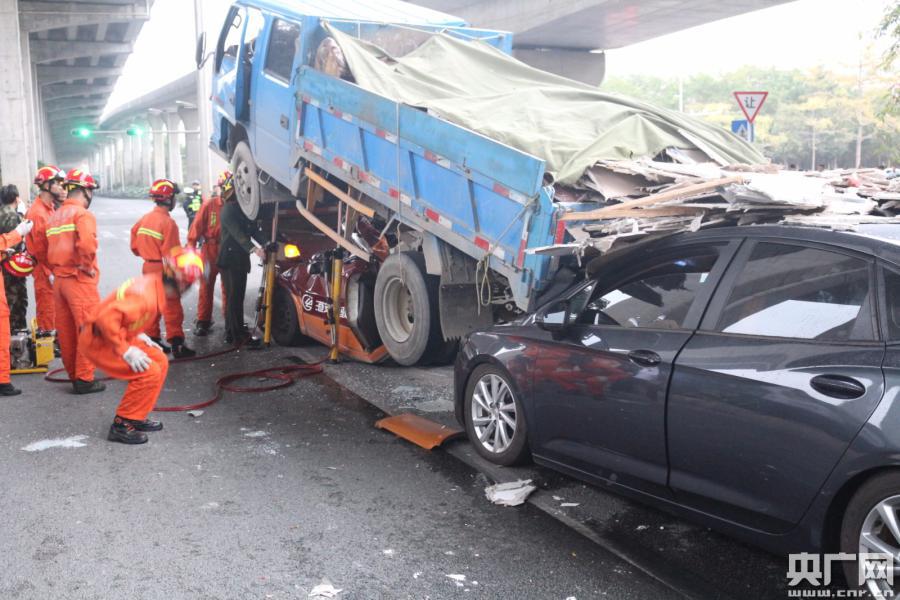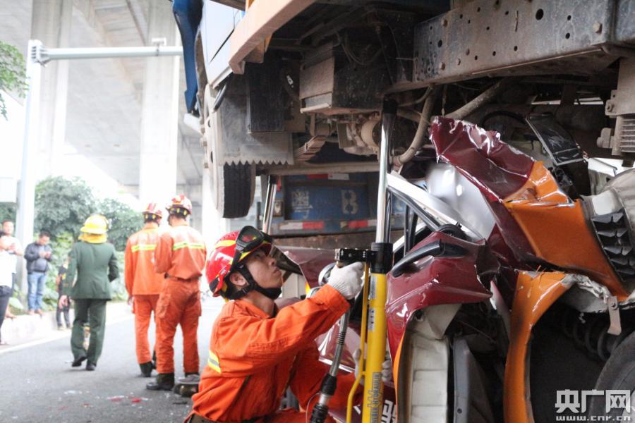 央廣網(wǎng)深圳2月20日消息(記者李強(qiáng) 通訊員黃源 唐麗曼)記者從深圳消防獲悉,2月19日17時35分,深圳南山區(qū)南海大道與留仙大道交界處往北方向發(fā)生一起七車連環(huán)相撞的嚴(yán)重交通事故,現(xiàn)場有人員被困。西麗消防中隊接警后立即出動3輛消防車15名指戰(zhàn)員火速趕赴現(xiàn)場處置。 據(jù)了解,事故為兩輛貨車、一輛駕校教練車、一輛混凝土攪拌車、兩輛小轎車和一輛SUV車七車連撞。其中教練車被夾在兩輛貨車中間,被后車埋壓,整車已嚴(yán)重變形,車內(nèi)有一女子被困,并有多車漏油。消防員立即展開救援行動,用水槍對漏油的車輛進(jìn)行稀釋冷卻,同時利用支撐頂桿撐起埋壓小車的大車,配合120救援人員對被困人員進(jìn)行輸液,為避免傷者收到二次傷害,中隊指揮員協(xié)調(diào)交警出動大吊車對壓頂?shù)牡踯囘M(jìn)行起吊,在壓住小車的大車被調(diào)開之后,消防員利用液壓擴(kuò)張器將嚴(yán)重變形的小車進(jìn)行破拆,成功將被困人員救出。在場的醫(yī)務(wù)人員立即將其送往醫(yī)院救治。 -
