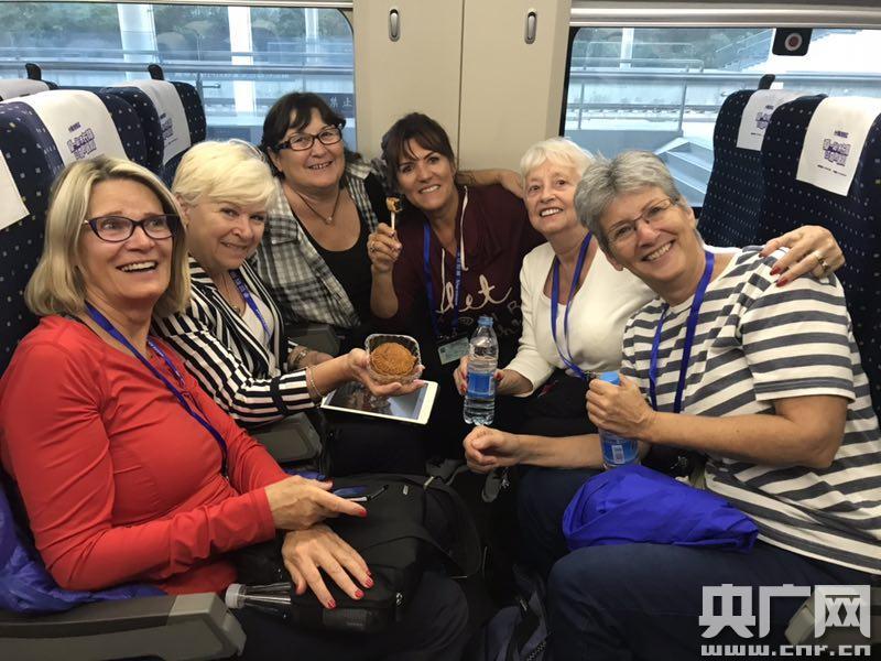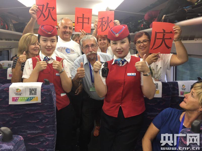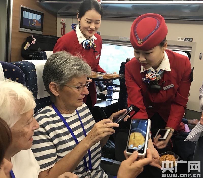 外國游客中秋節(jié)乘中國高鐵嘗中國月餅(央廣網記者 張毛清 攝) 央廣網武漢10月4日消息(記者張毛清 通訊員易娜 蘇杭)今天恰逢中秋佳節(jié),武漢鐵路局武漢客運段的乘務員為乘坐武漢到西安北G856次列車的旅客們,精心準備了水果、蛋黃、豆沙等多種口味的吉祥月餅。 3號車廂數十名加拿大籍的外國旅客首次來中國旅游,他們在高鐵上品嘗著美味的中秋月餅,對武鐵“鳳舞楚天”乘務組的貼心服務贊不絕口,連聲稱贊到“Very good!Very good!” -