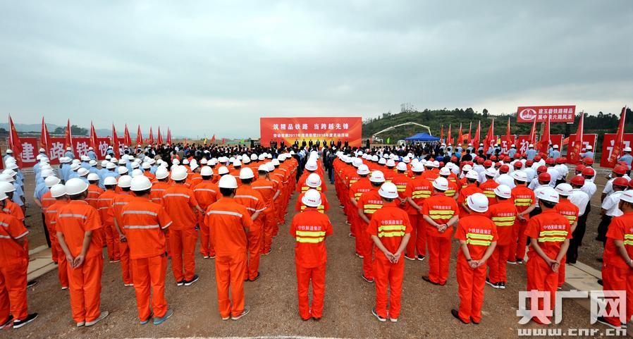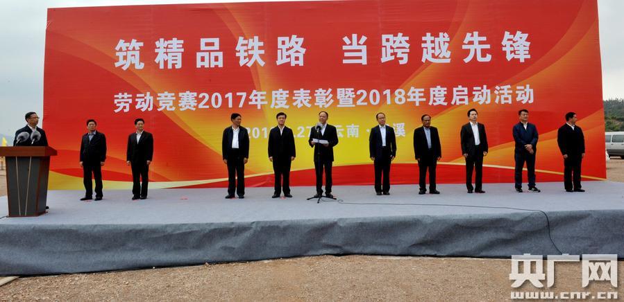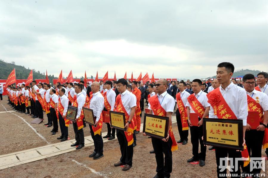 云南省“筑精品鐵路 當(dāng)跨越先鋒”勞動(dòng)競(jìng)賽啟動(dòng)儀式現(xiàn)場(chǎng)。(央廣網(wǎng)發(fā) 張偉明攝) 央廣網(wǎng)昆明4月28日消息(記者李健飛 通訊員張偉明)記者今日(4月28日)從中國鐵路昆明局集團(tuán)有限公司滇南鐵路建設(shè)指揮部獲悉,位于云南省玉溪市的在建中老國際通道玉磨鐵路研和站路基場(chǎng)坪土石方填筑基本完成,路基附屬工程全面展開,車站有望在年內(nèi)正式投入使用,這將是中老鐵路首個(gè)投入使用的大型貨運(yùn)站。 云南省人民政府、云南省總工會(huì)和中國鐵路昆明局集團(tuán)有限公司及40多家鐵路建設(shè)施工單位于4月27日在研和站舉行云南省“筑精品鐵路 當(dāng)跨越先鋒”勞動(dòng)競(jìng)賽2017年度表彰暨2018年度啟動(dòng)活動(dòng),通過勞動(dòng)競(jìng)賽的方式,大力弘揚(yáng)勞模精神和工匠精神,動(dòng)員參建各方爭(zhēng)創(chuàng)一流,比學(xué)趕超,奮勇爭(zhēng)先,加快云南“八出省五出境”鐵路網(wǎng)建設(shè),持續(xù)掀起鐵路建設(shè)高潮,加快把與周邊國家互聯(lián)互通的“接口”做好,更好地服務(wù)云南跨越式發(fā)展和“一帶一路”建設(shè)。 據(jù)統(tǒng)計(jì),2017年云南鐵路建設(shè)完成投資 207.3億元,昆明東站三級(jí)六場(chǎng)、昆明南站至昆明站客車聯(lián)絡(luò)線投產(chǎn)運(yùn)營,服務(wù)“一帶一路”的大(理)臨(滄)、玉(溪)磨(憨)、大(理)瑞(麗)等鐵路轉(zhuǎn)入施工高峰,廣(通)大(理)、永(仁)廣(通)鐵路進(jìn)入攻堅(jiān)期。27日上午,云南省政府和云南省總工會(huì)在競(jìng)賽活動(dòng)啟動(dòng)儀式上,對(duì)2017年參與云南鐵路建設(shè)業(yè)績(jī)突出的集體或個(gè)人進(jìn)行了表彰,分別授予他們?cè)颇鲜∥逡粍趧?dòng)獎(jiǎng)狀、云南省工人先鋒號(hào)、云南省鐵路建設(shè)先進(jìn)集體、云南省五一勞動(dòng)獎(jiǎng)?wù)潞驮颇翔F路建設(shè)先進(jìn)個(gè)人等榮譽(yù)稱號(hào),并號(hào)召鐵路建設(shè)各部門、各單位合力攻堅(jiān)、群策群力,高質(zhì)量推進(jìn)云南在建鐵路項(xiàng)目,為云南建成面向南亞東南亞輻射中心提供強(qiáng)有力的交通基礎(chǔ)設(shè)施保障。 帶著喜悅的心情,受表彰的先進(jìn)集體和個(gè)人觀摩了由中鐵六局承建的研和站,饒有興趣地了解車站建設(shè)情況,積極為云南鐵路建設(shè)出良謀獻(xiàn)良策。 中鐵六局路橋公司玉磨鐵路項(xiàng)目分部經(jīng)理毛朝勛介紹,研和站分別連接中越國際通道昆玉河鐵路和中老國際通道玉磨鐵路,是中越中老國際鐵路通道的重要貨運(yùn)樞紐。于2016年5月開工,計(jì)劃2018年年底投入運(yùn)營,目前研和車站路基場(chǎng)坪土石方挖填完成共計(jì)1000余萬方,已經(jīng)基本填筑完成,車站主體工程將于6月底完工。 研和站占地近2000畝,設(shè)列車到達(dá)和始發(fā)線正線8條,預(yù)留5條,配有集裝箱、散堆裝貨物、商品汽車和笨大貫通式、怕濕貨物線路及貨場(chǎng)。車站設(shè)計(jì)年貨運(yùn)量近期到發(fā)180萬噸,遠(yuǎn)期到發(fā)270萬噸。 中國鐵路昆明局集團(tuán)有限公司相關(guān)負(fù)責(zé)人介紹,今年云南鐵路統(tǒng)籌建設(shè)資源、管理技術(shù)形成攻堅(jiān)合力,全年鐵路建設(shè)投資計(jì)劃安排250億元。今年一季度,云南省完成鐵路建設(shè)投資 51.02億元,占全年計(jì)劃投資的20.4%。 黨的十八大以來,云南鐵路完成投資1253億元,投資規(guī)模是上一個(gè)5年的2.2倍。在近期國家批復(fù)的《中長(zhǎng)期鐵路網(wǎng)規(guī)劃》中,云南省列入中長(zhǎng)期規(guī)劃的項(xiàng)目有重慶至昆明高鐵、南昆鐵路擴(kuò)能改造、攀枝花至大理、蒙自至文山鐵路等18個(gè)項(xiàng)目,建設(shè)規(guī)模3485公里,總投資2965億元,規(guī)劃建設(shè)規(guī)模按省份劃分位列全國第二。