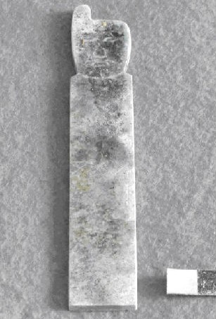 這次發(fā)掘出土的隨葬品,以墓一出土玉人最為特殊。該器為扁平青玉片,長12、寬2.1、厚0.5厘米,淺陰線雕刻一成年男子,右椎髻高聳,眼瞼長圓形,鼻準渾圓,口闊長方形。唇上兩撇胡須平折下垂,下垂三滴式長須。整體形式拙樸,僅雕刻出人體的大概輪廓,除頭部外,四肢皆省略。