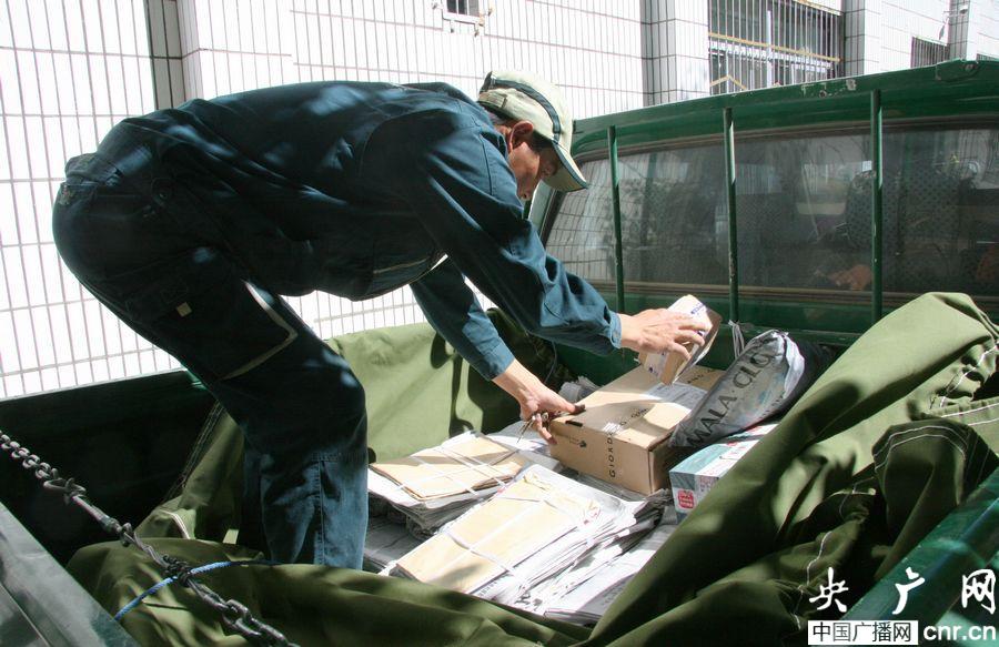 格桑正在認(rèn)真清點(diǎn)今天要派送的郵件和報紙(央廣網(wǎng)記者 普布次仁 攝)
