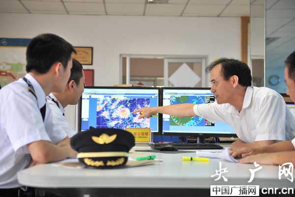 7月17日,南航?诨。氣象分析員正在為機(jī)組講解“威馬遜”的行進(jìn)路徑。當(dāng)日,受臺風(fēng)影響,南航大批客機(jī)離島避風(fēng)(徐勤濤拍攝)