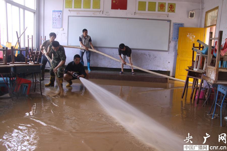 巫溪縣消防大隊官兵一大早就趕到了學校,消防官兵首先對學校食堂、教室、宿舍進行了清洗。記者看到,消防官兵沖刷過的地面比原來干凈了許多,消防官兵和學校工作人員正拿著掃把和水槍,在教室內一邊沖洗一邊刷地,將教室一間一間的沖洗干凈。