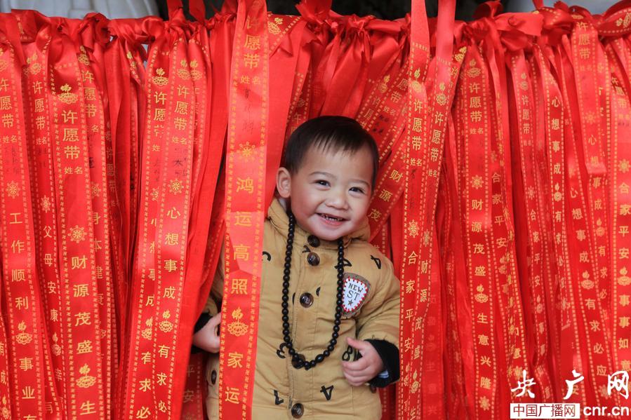 3月5日,在柳城縣鳳山鎮(zhèn)開山寺,一名小男孩在一大串許愿帶中玩耍