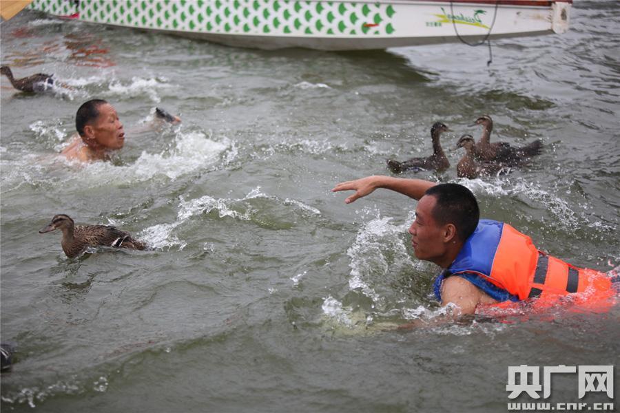 “搶鴨子”也是端午節(jié)重要民俗活動之一。?在之后進(jìn)行的“搶鴨子”民俗活動中,活動組織者將事先準(zhǔn)備好的活鴨放入江中,一聲令下后,參賽者們便從四面八方向鴨子撲去,一時間,水中搶鴨子熱火朝天,岸上加油聲此起彼伏,熱鬧非常。