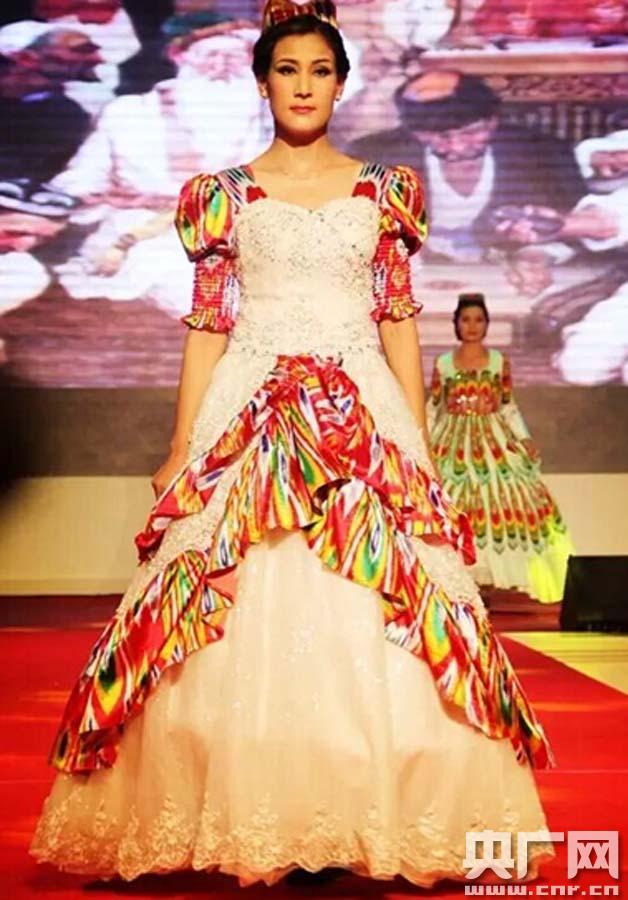 庫(kù)爾勒市選送的艾德萊斯旗袍服裝作品,通過(guò)獨(dú)特新穎的設(shè)計(jì)理念,以漢文化與維吾爾族文化融合為主體,運(yùn)用漢文化旗袍元素中的盤(pán)扣中國(guó)結(jié)等與維吾爾族的艾特萊斯綢相融合。這一系列服裝表達(dá)了民族大團(tuán)結(jié),以及祖國(guó)的繁榮昌盛,以服裝文化為載體呈現(xiàn)民族團(tuán)結(jié)與和諧社會(huì),給在座的觀眾和評(píng)委們留下了深刻的印象。