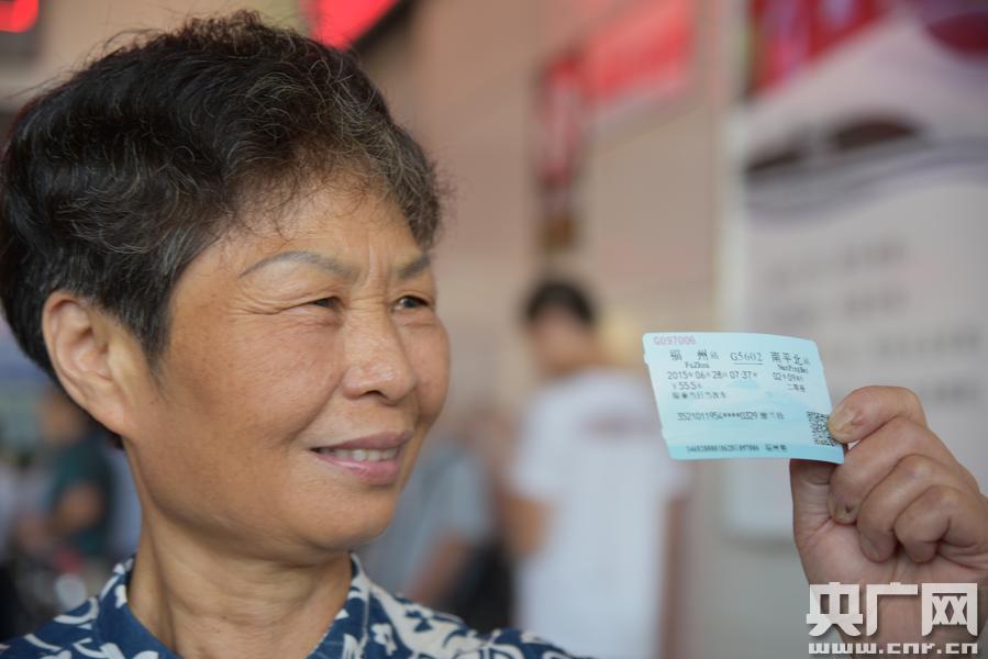 買到車票后,廖阿姨與記者分享了他的喜悅!罢娴奶炝耍F(xiàn)在從福州到南平只要40分鐘!”廖阿姨興奮地向記者展示了她剛剛買到的高鐵車票。 廖阿姨說,她經(jīng)常來往于福州與南平之間,以前乘坐火車去南平需要將近3個小時。她得知合福鐵路開建的消息后,就一直關注這條鐵路的建設進展情況。當廖阿姨得知合福高鐵車票要開售了,27日一大早就來到了福州火車站,希望能在第一時間買到去南平的車票。考慮到廖阿姨年歲較大,火車站工作人員安排廖阿姨在老、弱、病、殘、孕窗口優(yōu)先購票,圓了她的夢想。
