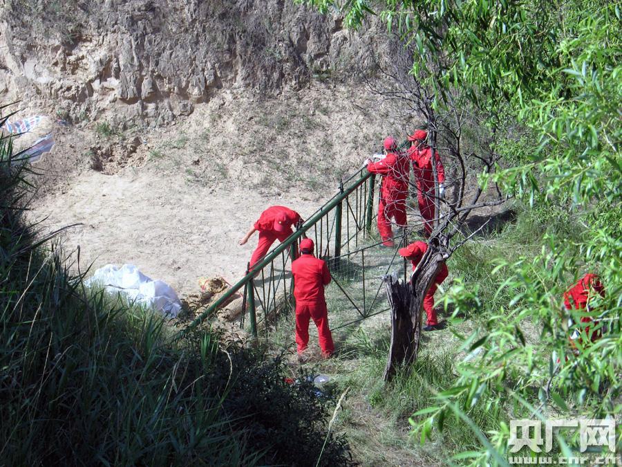 工作人員筑起第一道攔污設(shè)施(央廣網(wǎng)記者 雷愷 攝)