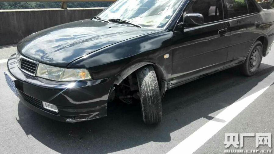 經(jīng)詢問得知,事故車主安師傅家住怒江州,中秋小長假到騰沖游玩,返回途中行至鐵杉隧道時,車子抖了幾下,安師傅就覺得車子的左前輪不聽使喚,他連忙緊握方向盤,確保車子保持正常路線。緊急時刻,剎車失靈了,幸好在拖行了七八十米后,車輛終于停了下來,隨即聽見“當”的一聲,剎車片居然滾了出來,左前輪也飛出了半個。