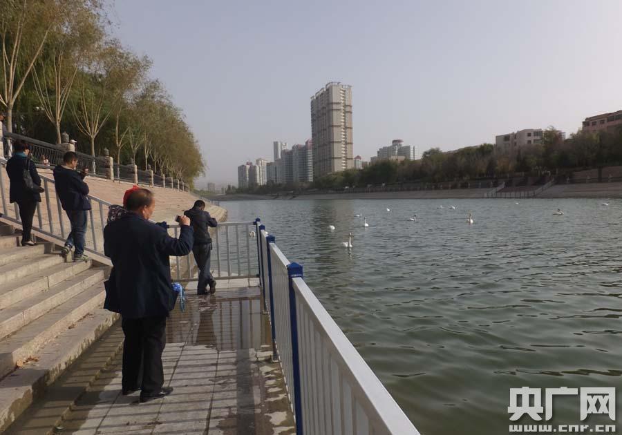 庫爾勒市民給天鵝拍照留念