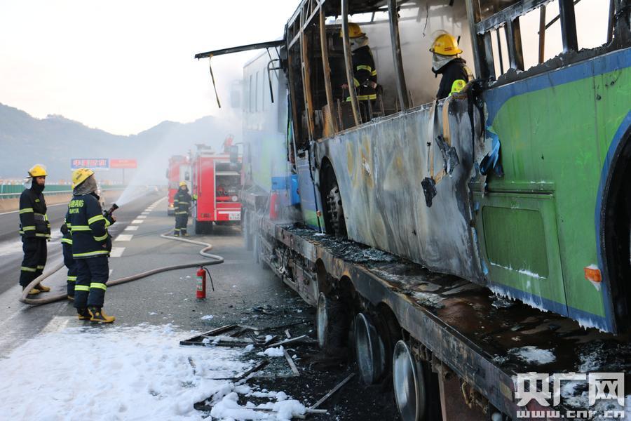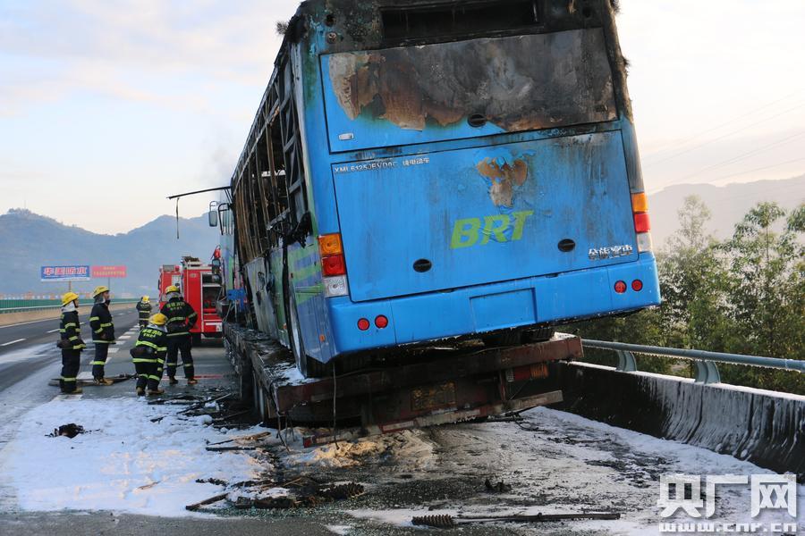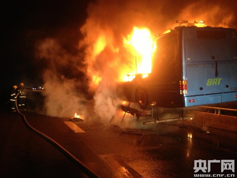 接警后,福州市消防指揮中心立即調(diào)集連江縣消防大隊鳳城中隊的兩部消防車和10名消防官兵,會同高速交警和路政部門趕到現(xiàn)場進行處置。到場時,兩輛車身標(biāo)有BRT字樣的公交車不同程度過火,其中一輛幾乎被大火吞噬,另一輛也已經(jīng)被引燃。截止當(dāng)日清晨7時30分許,明火被徹底撲滅。
