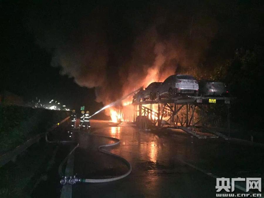 央廣網(wǎng)南寧1月26日消息(記者 張壘 許大為 通訊員 鐘德林)1月25日20時(shí)許,G80線廣昆高速公路岑溪段發(fā)生一起重型掛車行駛中起火,導(dǎo)致所運(yùn)載的13輛小汽車燒毀,無(wú)人員傷亡,交通暫時(shí)中斷,當(dāng)?shù)叵馈⒔痪綀?chǎng)處置。