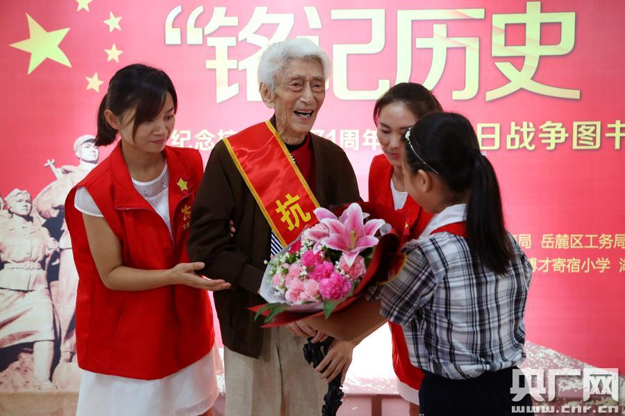 授牌儀式上,年逾九旬的抗戰(zhàn)老兵張默堅被請到臺前,兩名博才寄宿小學生代表為他獻上了鮮花。張老希望大家銘記歷史、奮發(fā)圖強、為中華民族崛起而努力。