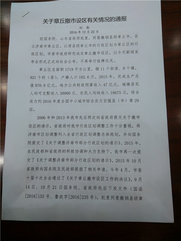 關(guān)于章丘撤市設(shè)區(qū)有關(guān)情況的通報