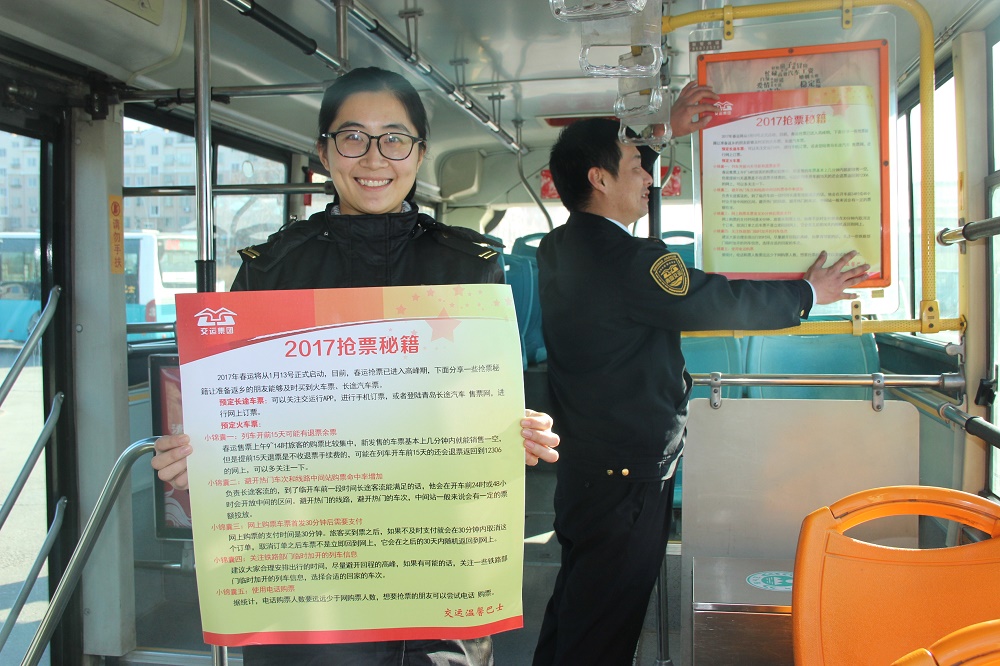 央廣網(wǎng)青島1月18日消息(記者王偉 通訊員朱琰琰)記者從交運溫馨巴士公司獲悉,為方便市民購票,溫馨巴士公司在新市民客流量較大的隧道3路、隧道4路、隧道7路、隧道8路、605路、606路、608路等數(shù)十條公交線路共200余部車上發(fā)布了汽車票、火車票的“搶票秘笈”。