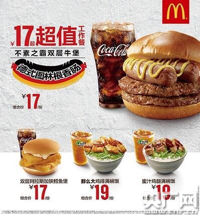 央廣網(wǎng)深圳3月30日消息(記者于揚(yáng))困擾上班族的世紀(jì)難題:中午吃什么?想必不少上班族都曾糾結(jié)過(guò)這個(gè)問(wèn)題。現(xiàn)在,你的午餐有了更多新選擇——3月29日起,全國(guó)麥當(dāng)勞餐廳全新上線17元超值工作餐、6元成套早餐、草莓派及草莓口味奇樂(lè)酷新品,更有《藍(lán)精靈:尋找神秘村》系列玩具、藍(lán)精靈主題麥趣雞盒和《全職高手》限量版主題麥樂(lè)卡。超值新品,花樣多多。3月29日起,17元起超值工作餐在麥當(dāng)勞全新上市。每周一至周五,不素之霸雙層牛堡、雙層阿拉斯加狹鱈魚堡、那么大雞排滿碗飯、蜜汁雞腿滿碗飯,4款足料主食任選其一,搭配指定中杯飲料,只要17元起。其中,不素之霸雙層牛堡是麥當(dāng)勞人氣漢堡,選用德式圖林根香腸,Q彈多汁肉,再加兩塊100%純牛肉餅,佐以黃芥末醬,造就雙倍肉感,讓上班一族滿滿能量!
