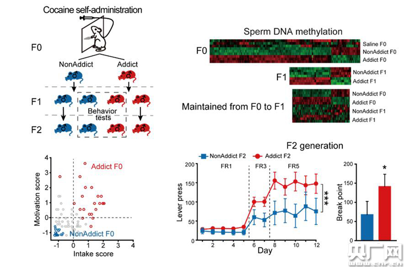 馬蘭研究團(tuán)隊(duì)樂秋旻、顏彪博士等人采用大鼠可卡因自身給藥成癮模型,讓雄性大鼠學(xué)會(huì)在需要毒品時(shí),通過觸動(dòng)踏板來獲得可卡因注射,并通過不斷增加踏板任務(wù)難度,衡量大鼠對(duì)可卡因的渴求程度,即覓藥動(dòng)機(jī)。通過測(cè)試將評(píng)分最高(成癮組)和最低(非成癮組)兩群大鼠分別與沒有接觸過可卡因的正常雌鼠交配,產(chǎn)生后代,以觀察父代可卡因成癮是否會(huì)對(duì)后代產(chǎn)生影響。對(duì)第一代仔鼠的可卡因自身給藥測(cè)試結(jié)果顯示,成癮組和非成癮組大鼠的后代表現(xiàn)明顯不同:成癮組大鼠的第一代仔鼠踏板獲得可卡因的動(dòng)機(jī)明顯比非成癮組要更加強(qiáng)烈。這種較高的成癮性在第二代仔鼠身上也能觀察到,說明可卡因的成癮行為可以跨代遺傳。