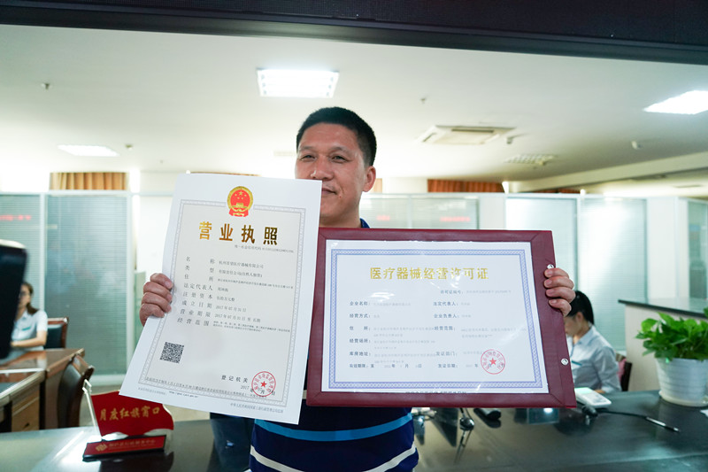 央廣網(wǎng)桐廬7月31日消息(記者陳瑜艷 通訊員錢凌蕓 桐廬臺朱妍雯)7月31日下午,在桐廬縣行政服務(wù)中心市場監(jiān)管局窗口,做醫(yī)療器械生意的周坤;瞬坏桨胄r時間,就拿到了其新公司的營業(yè)執(zhí)照,并在簽訂一份告知承諾書之后拿到了第三類醫(yī)療器械經(jīng)營證。當工作人員告訴他,馬上就可以正式經(jīng)營公司了,周坤海說,“準營準入簽個協(xié)議就一步到位,快得出乎意料。”
