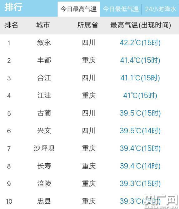 據(jù)敘永氣象局工作人員介紹,當(dāng)日的最高溫度出現(xiàn)在下午14時(shí)17分,達(dá)到42.2℃,再次刷新今年當(dāng)?shù)氐母邷赜涗,距該縣有氣象記錄以來(lái)的最高溫度43.5℃只差1.3℃。