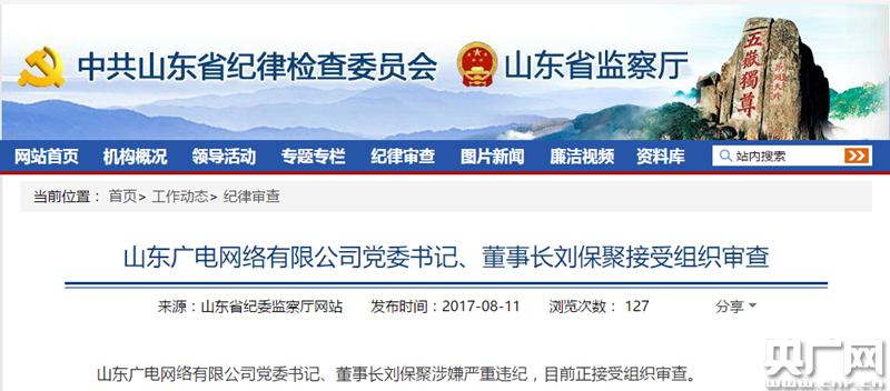 央廣網(wǎng)濟(jì)南8月11日消息(記者劉?)11日,記者從山東省紀(jì)委監(jiān)察廳網(wǎng)站了解到,山東廣電網(wǎng)絡(luò)有限公司黨委書(shū)記、董事長(zhǎng)劉保聚涉嫌嚴(yán)重違紀(jì),目前正接受組織審查。
