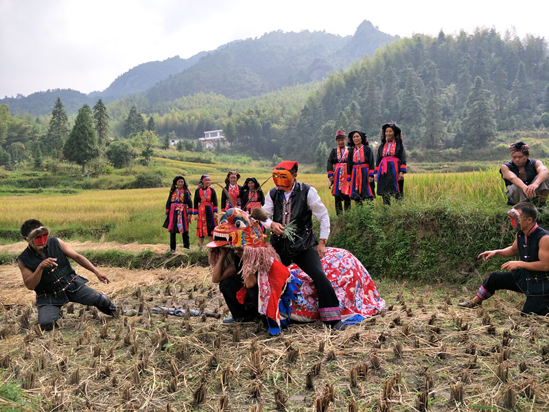 田間舞獅是瑤族同胞的一種傳統(tǒng)民俗活動,多在秋季收割稻谷時進行。在收割完稻谷的田里,身著民族服裝的瑤族同胞歡聚一堂,頭戴猴像面具的瑤胞,引獅出場,伴隨歡快的鑼鼓聲,金猴盡使逗樂調侃手段,表演十分風趣。猴子滑稽詼諧、輕靈乖巧的伴舞與獅子的端莊威武、凝重厚樸的表演形式形成鮮明的對比,給人以別具一格的視覺沖擊和心靈震撼。