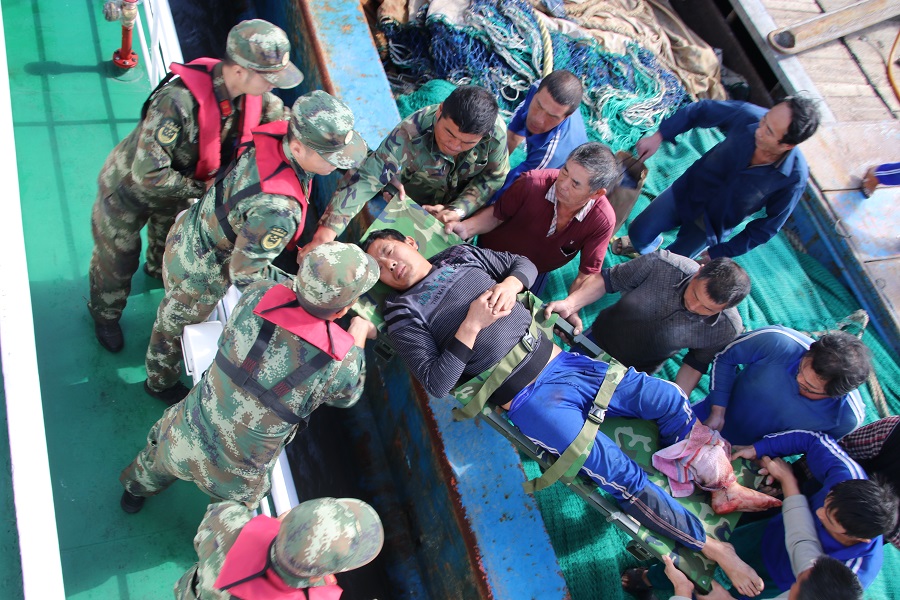 11時(shí)45分,海警33041艇趕到青浜島附近海域搜尋到浙普漁41XXX船,由于當(dāng)時(shí)海上風(fēng)浪大太,船艇搖晃劇烈,無法靠穩(wěn),海警官兵只好將受傷漁民抬起,僅僅用了十分鐘,順利將受傷漁民轉(zhuǎn)移到海警艇上。經(jīng)過隨船醫(yī)護(hù)人員的緊急救助,受傷船員意識清醒,生命體征穩(wěn)定。12時(shí)50分,海警33041艇順利將受傷船員移交給早已等候在碼頭的醫(yī)護(hù)人員,并送往醫(yī)院進(jìn)一步治療,臨走時(shí)傷者家屬和漁船負(fù)責(zé)人對海警官兵能夠及時(shí)開展救助態(tài)度、為人民服務(wù)的真情表示真心感謝。