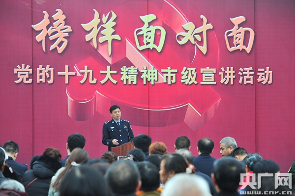 據(jù)了解,為更好地推動(dòng)十九大精神家喻戶曉,重慶市組織各地、各行業(yè)領(lǐng)域的先進(jìn)典型組成“榜樣面對(duì)面”黨的十九大精神宣講團(tuán),深入城鄉(xiāng)社區(qū)、基層單位,向群眾面對(duì)面地宣講十九大精神。為此,市公安局組織陳冰、樊勁松、冉義智等13名全市公安機(jī)關(guān)先進(jìn)典型組建“榜樣面對(duì)面”十九大精神宣講團(tuán)市公安局分團(tuán),深入基層一線與群眾開展十九大精神面對(duì)面宣講,立足工作崗位和學(xué)習(xí)生活實(shí)際,聯(lián)系百姓身邊發(fā)生的變化,結(jié)合群眾普遍關(guān)心關(guān)切的問題,生動(dòng)形象地宣傳黨的十九大精神。