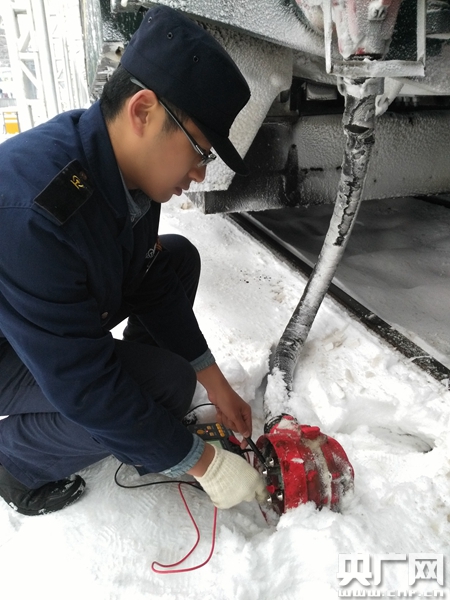 1月26日,鄧偉值乘的K118次旅客列車從攀枝花出發(fā)時,外溫是23度,他在庫內(nèi)干活時還穿的是短袖,車剛出發(fā)時空調(diào)是在制冷位。1月26日深夜,列車到達成都,外面已經(jīng)在飄雪。而駛離成都,列車一路向北,氣溫越來越低。眼前的雪景從成都出發(fā)的稀稀落落到車窗外皆是白雪皚皚。較大的溫差對空調(diào)裝置的使用是一個考驗,他和同事一路都在監(jiān)控著空調(diào)的運行狀態(tài)。每到作業(yè)站點,就踏著站臺的雪,仔細檢查車體走行部制動、懸吊等裝置是否良好,確保列車安全運行。