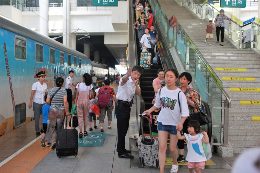 工作人員引導(dǎo)游客進(jìn)站乘車 張永恒攝