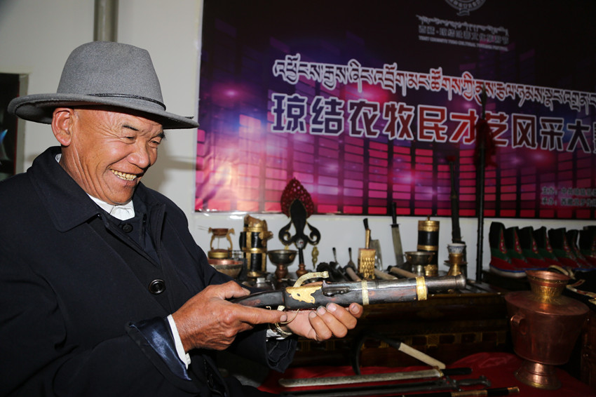 農(nóng)民選手們紛紛展示了精心準(zhǔn)備的服飾、鐵器、唐卡、酥油花、藏式家具等展品,為前來參觀的干部群眾送上了一場視覺盛宴。據(jù)了解,全場共有9個(gè)文藝類節(jié)目、12個(gè)絕技類作品、14個(gè)絕活類展品參加比賽,最終7個(gè)選手成功晉級。獲獎(jiǎng)的選手將在7月29日亮相“2018西藏·瓊結(jié)第三屆吐蕃文化旅游節(jié)”閉幕式,在閉幕式上進(jìn)行統(tǒng)一頒獎(jiǎng)。